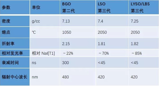 (1)晶體:從理論上講,表1所列幾種晶體均可以用于PET探測(cè)器,但是從臨床經(jīng)驗(yàn)來看,目前用于PET探測(cè)器的晶體主要有BGO、LYSO、LSO和LBS等四種。其中LYSO、LSO以及LBS這類晶體由于含有金屬镥(Lutetium),因此余輝時(shí)間明顯減少。一般認(rèn)為晶體余輝時(shí)間小于80ns(納秒)就可以實(shí)現(xiàn)飛行時(shí)間(Time of Flight, TOF)技術(shù)。而BGO等晶體余輝時(shí)間太長,不能實(shí)現(xiàn)TOF技術(shù),即將淘汰(1,2)。當(dāng)然,含镥晶體(LSO、LYSO)也有其不足,就是含有自身本底放射性,有效原子序數(shù)偏小,會(huì)導(dǎo)致射線探測(cè)效率降低。所以,一般講LYSO、LSO和LBS這類晶體在PET探測(cè)器中其最佳長度為20mm左右(3)。所以,如果選擇LYSO、LSO或LBS這一類晶體,那么就必須具有TOF技術(shù)來彌補(bǔ)或克服其探測(cè)效率低的固有缺陷。