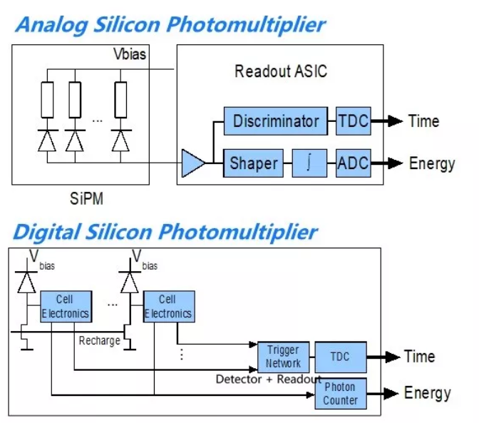 SiPM較傳統(tǒng)的PMT而言,采用了半導(dǎo)體集成電路芯片技術(shù)。這種半數(shù)字化芯片產(chǎn)品,體積明顯減小,可以做到高度的集成化,同時(shí)可以實(shí)現(xiàn)PET中關(guān)鍵的TOF技術(shù)。但是,模擬信號(hào)到數(shù)字信號(hào)的A/D轉(zhuǎn)換依然需要后續(xù)ASIC電路來解決,SiPM只是和原來的PMT一樣,單純的進(jìn)行信號(hào)的接受放大,其采集到的電信號(hào)通過后續(xù)的電路去估算大致的光子計(jì)數(shù),并轉(zhuǎn)化成數(shù)字信號(hào),一個(gè)輸出=所有脈沖的疊加,處理過程依然受到模擬電路的影響(3,7)。