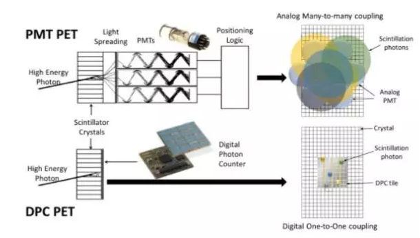 C、數(shù)字光子計(jì)數(shù)DPC(Digital photon counting)。鑒于上述SiPM的一些缺點(diǎn),DPC應(yīng)運(yùn)而生。