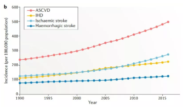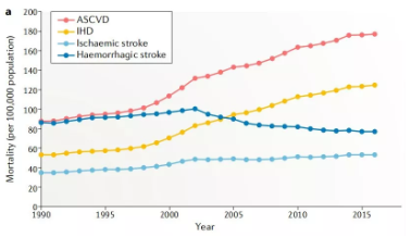 腦卒中、冠心病等心血管疾病(Cardiovascular disease,CVD)是造成我國(guó)居民死亡和疾病負(fù)擔(dān)的首要病因,占中國(guó)死亡人口的40%,CVD發(fā)病率呈現(xiàn)逐年快速攀升的趨勢(shì),目前我國(guó)CVD患者超過 2.9 億例。動(dòng)脈硬化性心血管疾?。ˋtherosclerotic cardiovascular disease,ASCVD)是一種單一類型的心血管疾病,包括缺血性卒中(Ischaemic stroke)和缺血性心臟?。↖schaemic heart disease,IHD)。從1990年至2016年,ASCVD的死亡人口增加近100萬,據(jù)統(tǒng)計(jì)2016年約有240萬人死于ASCVD,占CVD總死亡人口的61%,占所有死亡的25%。