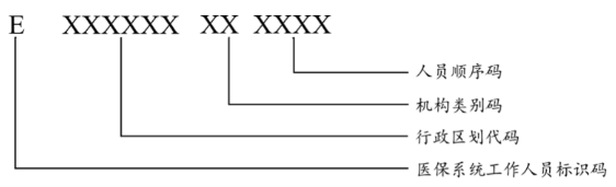 第1部分:醫(yī)保系統(tǒng)工作人員標(biāo)識(shí)碼,用1位大寫英文字母“E”表示。