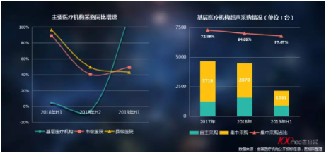 從相關(guān)政策和以上數(shù)據(jù)圖表可以看出,在主要醫(yī)療機(jī)構(gòu)采購?fù)仍鏊龠@一方面,只有基層醫(yī)療機(jī)構(gòu)有大幅度的增長。而從年份來看基層醫(yī)療機(jī)構(gòu)超聲采購情況,采購數(shù)量逐年減少,而政府的集中采購與醫(yī)療機(jī)構(gòu)的自主采購的比例也同樣在下降。