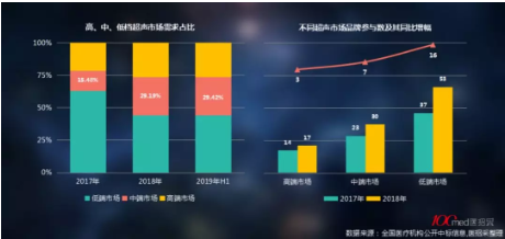 2017年,低端超聲市場需求占比較大,2018年和2019年上半年,三個(gè)層次的市場比例則相對較為穩(wěn)定。實(shí)際上,低、中、高端市場都在競爭超聲市場的增長與擴(kuò)容,希望分得一塊蛋糕,不僅僅在基層,同樣在市級、縣級醫(yī)院也會產(chǎn)生一定的增量。隨著整個(gè)超聲市場的增長和擴(kuò)容,加入的品牌也越來越多。