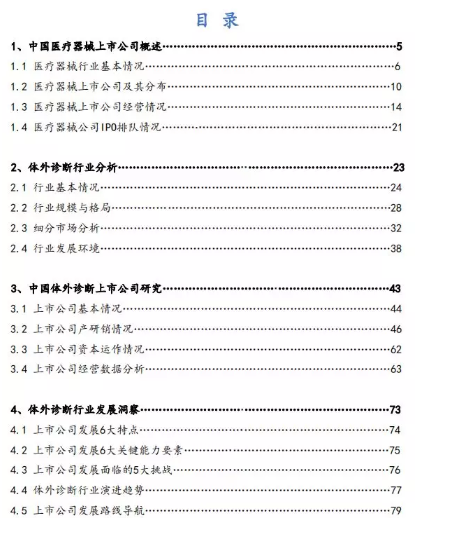 ●體外診斷行業(yè)分析:包括了產(chǎn)業(yè)發(fā)展歷程,產(chǎn)品分類,上下游產(chǎn)業(yè)鏈分析,總體市場規(guī)模和格局,生化、免疫、分子、 POCT細(xì)分領(lǐng)域規(guī)模和格局、產(chǎn)業(yè)驅(qū)動因素,產(chǎn)業(yè)發(fā)展機(jī)會和技術(shù)生命周期,宏觀發(fā)展的政治、經(jīng)濟(jì)、社會和技術(shù)環(huán)境。