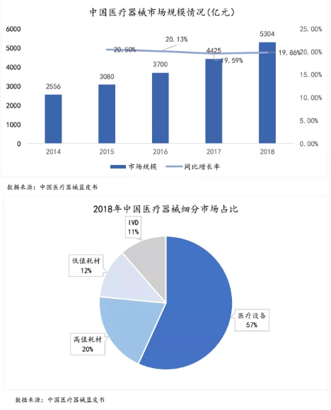 隨著國內(nèi)經(jīng)濟(jì)水平的發(fā)展,民眾支付能力的提升,人口老齡化的增加,健康需求不斷增加,中國醫(yī)療器械市場保持高速增長。2018年中國醫(yī)療器械市場規(guī)模約為5304億元,同比增長19.86%,預(yù)計未來5年將繼續(xù)保持15%以上年復(fù)合增速,遠(yuǎn)高于國內(nèi)GDP增速。醫(yī)療設(shè)備市場是中國醫(yī)療器械最大的細(xì)分市場,占比 56.80%;其次為高值醫(yī)用耗材市場,占比 19.72%,IVD占比約11%。