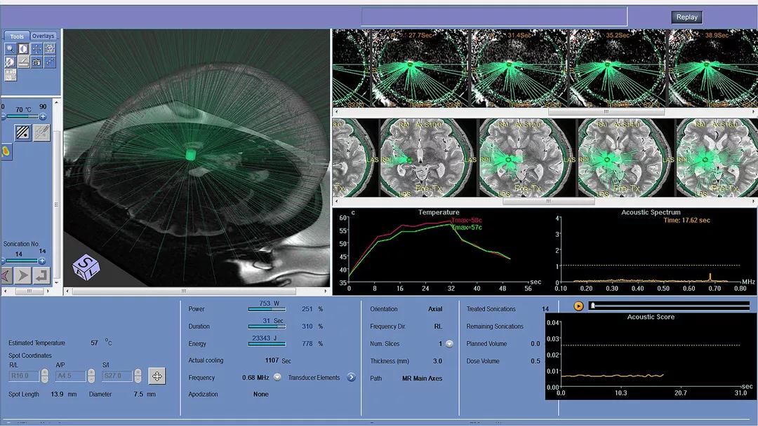 Exablate Neuro 用于對藥物難治性突發(fā)性震顫患者進行單側丘腦切開術治療。其超聲波可安全穿過腦顱,聚合后將震顫致病靶點(即丘腦的 VIM 核)加熱融化。
