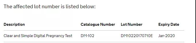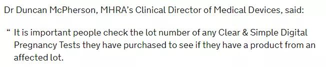 譯:MHRA醫(yī)療器械的臨床主任鄧肯·麥克弗森博士說:人們要重點(diǎn)檢查他們購(gòu)買的任何清晰和簡(jiǎn)單的數(shù)字妊娠測(cè)試的批號(hào),看看他們是否有來自受影響批號(hào)的產(chǎn)品。