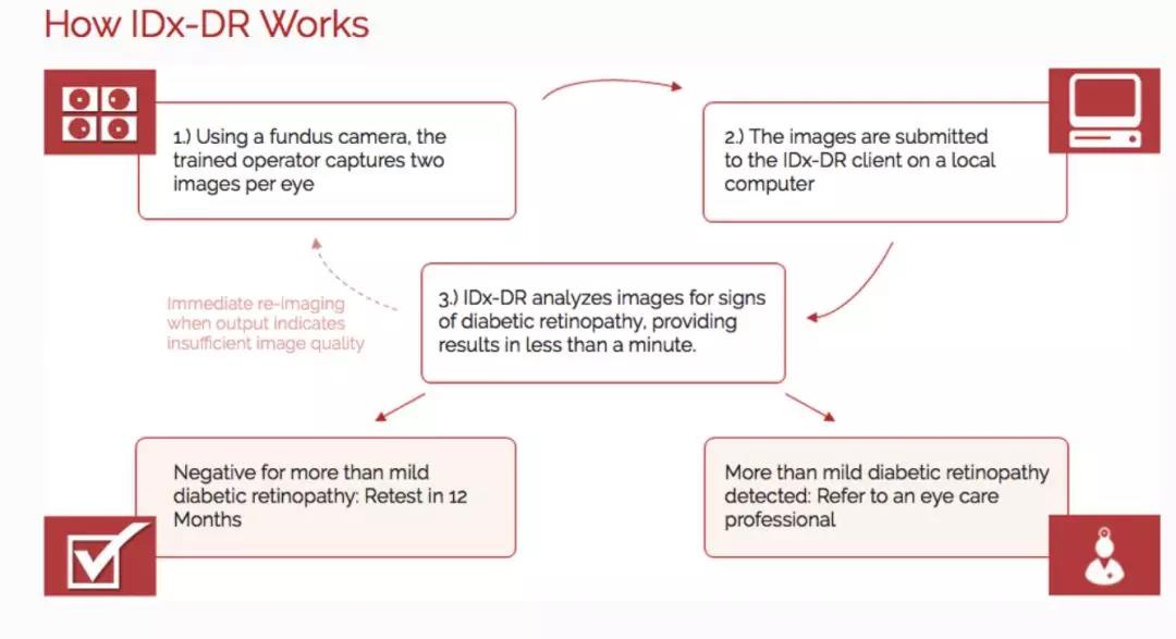 與預(yù)約真人醫(yī)生相比,IDx-DR 真的是太方便簡單了,只需要護(hù)士或者醫(yī)生通過使用特殊的視網(wǎng)膜照相機(jī)拍下患者的視網(wǎng)膜照片,隨后按照 IDx-DR 軟件的指示上傳圖像,并確定圖像的質(zhì)量是否足夠獲得分析結(jié)果。如果圖像合格,軟件將自動分析(無須專業(yè)醫(yī)生參與)患者是否患有糖尿病性視網(wǎng)膜病變,并將根據(jù)結(jié)果診斷并決策后續(xù)治療。