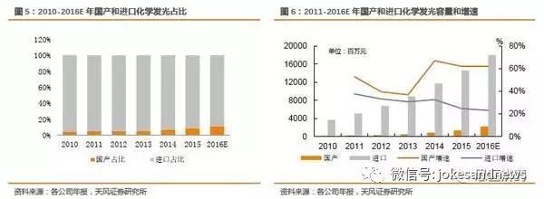 2016年化學(xué)發(fā)光市場容量接近200億,國產(chǎn)占比不到20億,但是只考慮總的市場容量是不合理的,因?yàn)橐阅壳皣a(chǎn)水平難以和進(jìn)口競爭,所以我們分析市場有效空間。