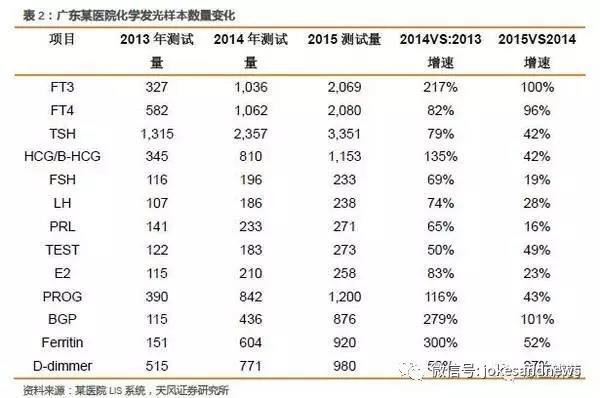 廣東省某基層醫(yī)院,一級甲等,2014年檢驗(yàn)科收入約為1000萬。2013年開始使用國產(chǎn)全自動發(fā)光儀,開展項(xiàng)目主要為甲功、激素兩個(gè)套餐。2015-2013年樣本增量變化如下。