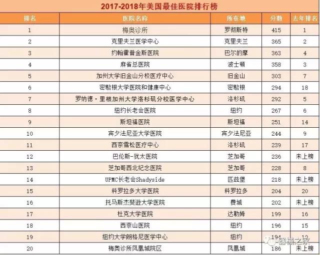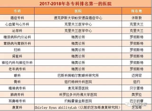 在醫(yī)療界梅奧診所就是傳說中的麥加,世界頂尖的醫(yī)療機(jī)構(gòu)。2017年8月8日,《美國(guó)新聞與世界報(bào)道》公布了2017-2018美國(guó)最佳醫(yī)院排行榜,梅奧診所以415分的總分再次榮登榜首,并在糖尿病和內(nèi)分泌??啤⑽改c科、婦科、腎臟科、神經(jīng)??坪屠夏瓴W(xué)六個(gè)??浦信琶谝弧?/span>