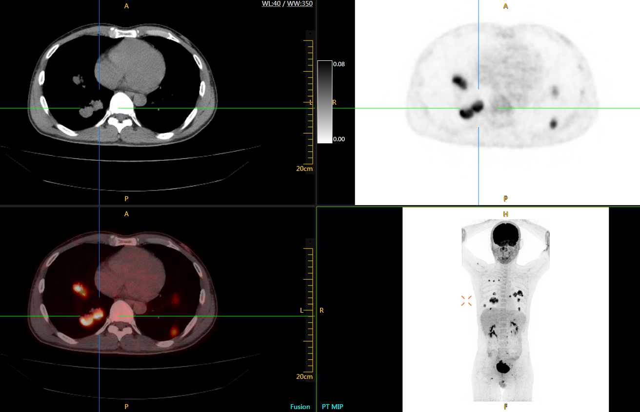 患者男性,66歲,七年前發(fā)現(xiàn)右肺肺癌,其間手術(shù)兩次,共切除兩個肺葉,復(fù)查;