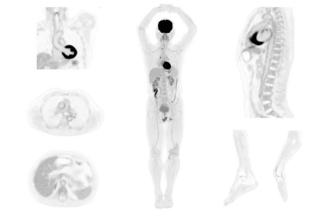 注射總劑量為7.8mCi,注射后1.6小時,基于uEXPLORER探索者掃描1分鐘的圖像