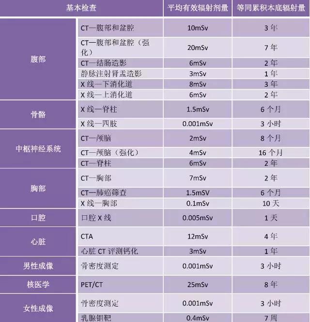 臨床中,常會遇到患者在影像檢查前問醫(yī)生,是否有輻射,有多大的輻射呢?下圖是ACR,RSNA等組織聯(lián)合制定的常見影像學(xué)檢查平均輻射劑量的參考值,或許可以為你更好的回答患者的問題提供借鑒。