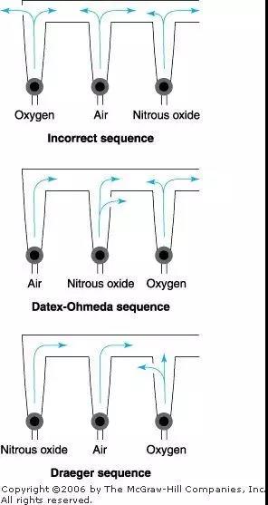 另外,不知道大家有沒有觀察過流量計(jì)的順序問題,其實(shí)這也有講究。也就是把氧流量計(jì)安裝在最靠近共同出口處,萬一在氧上風(fēng)位發(fā)生的漏口,這樣流失的大部分是N?O或者空氣,O?損失最少。當(dāng)然,它的順序也不能保證不發(fā)生因流量計(jì)破裂所致的低氧。