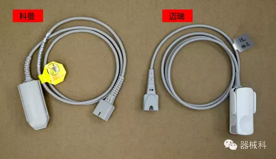 兩家使用的血氧探頭有明顯的區(qū)別??坡目瓷先ジ~瑞的設(shè)計看起來新超大氣,顏色更白。不知道用久了,會不會發(fā)黃變色。看了一下探頭的發(fā)光管和接收管,居然是一樣的,從發(fā)光管和接收管的外形上看用的都是OSI的,看來在這一點上大家都比較認可這家頂級老牌生產(chǎn)的管子。用手指感受了一下兩家的探頭,邁瑞的選用的材料比較柔軟,在感受上比較舒適,科曼的探頭襯墊手感上要硬朗一些,不過也不會有任何的不適。