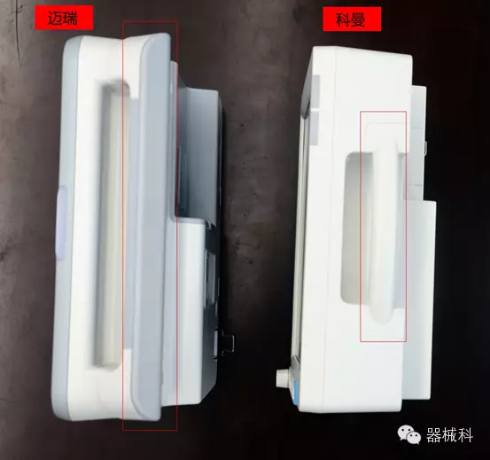 科曼與邁瑞因機身尺寸上有區(qū)別,所以手柄方面,科曼明顯比邁瑞要小??坡捎么蠡《龋尸F(xiàn)橢圓截面的設(shè)計;邁瑞采用方形小圓角,折疊活動式的提手,塑膠包裹。手柄嬌小,不利于握持,但重心集中,更穩(wěn)定;手柄碩大,活動范圍廣,卻也容易晃動。