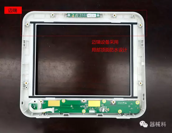 防水是所有電子類產(chǎn)品的一個重要功能。如果防水功能設(shè)計不好,儀器很容易受潮,從而引起使用不便,嚴重的將會報廢??坡昂髿ぶg采用硅膠密封線整圈的防水設(shè)計,做工更麻煩,耗材多,但更安全;邁瑞前后殼之間采用硅膠密封線頂部的局部防水設(shè)計,省時省料,但存在安全隱患。