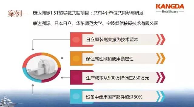他列舉了康達洲際1.5T超導(dǎo)磁共振項目:在此項目的突破上,康達積極和大專院校進行技術(shù)合作。同上海華東師范大學(xué)磁共振實驗室(上海市重點實驗室)進行深度合作,雙方的科研團隊精誠合作,在剩磁處理,自動勻場、新臨床序列開放、圖像深度處理等一系列研發(fā)目標(biāo)上均取得突破,并實際應(yīng)用到康達產(chǎn)品中去,實現(xiàn)了從“實驗室”到“車間”的無縫銜接,真正將中國本土智慧展現(xiàn)在實業(yè)之中。