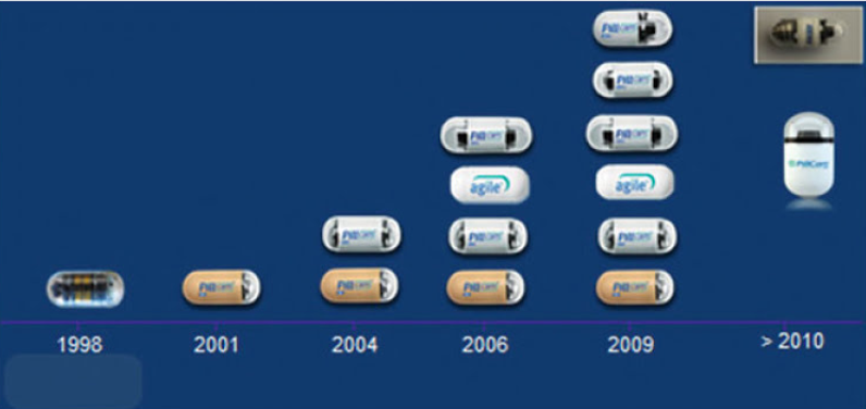 自那時(shí)起,Given Imaging生產(chǎn)了第二代和第三代小腸膠囊內(nèi)窺鏡(pillcam sb3),研制了兩代雙向食管膠囊內(nèi)窺鏡(pillcam colon2),并開(kāi)發(fā)了兩代開(kāi)放膠囊內(nèi)窺鏡。