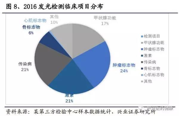 在發(fā)光檢驗終端分布中,有醫(yī)院、血站、獨(dú)立實驗室、體檢中心和防疫站等,90%以上在醫(yī)院。