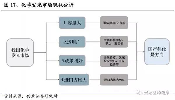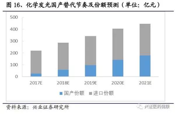 目前,化學(xué)發(fā)光行業(yè)以25%-30%的增速增長,現(xiàn)國內(nèi)企業(yè)已突破技術(shù)壁壘,進(jìn)入銷售放量階段,參考生化替代的節(jié)奏,5年內(nèi)可占有近一半的市場份額。預(yù)計在2021年,國內(nèi)廠家可總共占有百億以上的市場份額。
