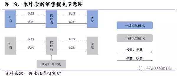 醫(yī)院是產(chǎn)業(yè)鏈上最強(qiáng)勢的一環(huán),國產(chǎn)產(chǎn)品對醫(yī)院的吸引力決定著國產(chǎn)替代進(jìn)程。在銷售模式上,公司多采用直銷和經(jīng)銷相結(jié)合,以經(jīng)銷為主。對于醫(yī)院終端,儀器基本以投放獲得,廠商以搭配銷售試劑的方式獲得收益。體外檢測等醫(yī)療服務(wù)由政府統(tǒng)一定價,應(yīng)用化學(xué)發(fā)光法可相應(yīng)提高收費(fèi)標(biāo)準(zhǔn)(例如:福建省用化學(xué)發(fā)光法可加價80%)。因此,試劑屬于醫(yī)院的“成本項”,醫(yī)院有動力對檢測方法進(jìn)行升級迭代,但卻并沒有動力去特意抬高價格,在相同條件下會考慮試劑性價比,相對市場化。