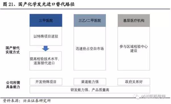 對于三甲醫(yī)院,其技術(shù)偏好較高,從目前的市場反應(yīng)來看,國產(chǎn)發(fā)光儀器和試劑的精確性和穩(wěn)定程度仍不能達(dá)到三甲醫(yī)院的要求。同時三甲醫(yī)院多有聲譽(yù)追求,對進(jìn)口品牌的忠誠度高。在價格上,樣本量大、檢驗結(jié)果質(zhì)量要求高、檢驗人員成本高致使其相對價格不敏感。而國內(nèi)廠家對于試劑的研發(fā)仍停留在檢測項目的拓展上,基于現(xiàn)狀,大規(guī)模進(jìn)口替代較難實現(xiàn)。有些特殊項目未涉及,如藥物濃度檢測等,可作為突破口進(jìn)駐高端醫(yī)院,建立品牌形象。總體來說,短期內(nèi)國內(nèi)廠商可依靠特殊項目檢查可獲得三級醫(yī)院小部分份額,長期來看,想進(jìn)駐高端醫(yī)院并獲得主力項目的份額,須加大研發(fā)投入,做好做精發(fā)光試劑,打破醫(yī)院對于國產(chǎn)山寨的慣性認(rèn)知。