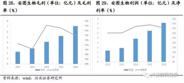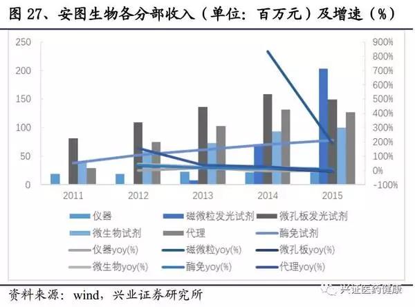 安圖生物業(yè)績成長迅速,2012年至2016年增速均保持25%以上,營收CAGR為32.5%。2016年實現(xiàn)營業(yè)總收入9.8億元,同比增長36.87%。其中,磁微粒發(fā)光試劑從2013年起產(chǎn)生收入,2015年收入達(dá)2億元,增速大于100%。
