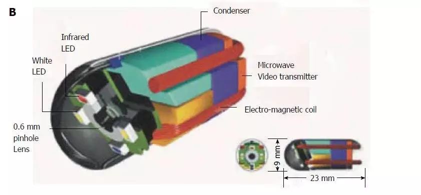 膠囊內(nèi)鏡的尺寸為9 mm×23 mm,0.6毫米彩色鏡頭和410000像素電荷耦合設(shè)備相機(jī)可以獲得高達(dá)每秒30幀(fps),只需患者穿著將微波傳輸?shù)侥z囊的背心。兩個(gè)罐與閥定位在中心和一個(gè)有用于存儲(chǔ)電力以及微波視頻信號(hào)發(fā)射機(jī)。在相機(jī)鏡頭周?chē)胖昧怂膫€(gè)白色LED和用于調(diào)焦的磁線圈。更重要的是,40%的體積是自由空間,可用于手術(shù)目的,如藥物噴霧,激光治療,pH傳感等。雖然這種膠囊已經(jīng)在網(wǎng)上描述了十多年,至今仍沒(méi)有對(duì)這種膠囊進(jìn)行人體實(shí)驗(yàn)。