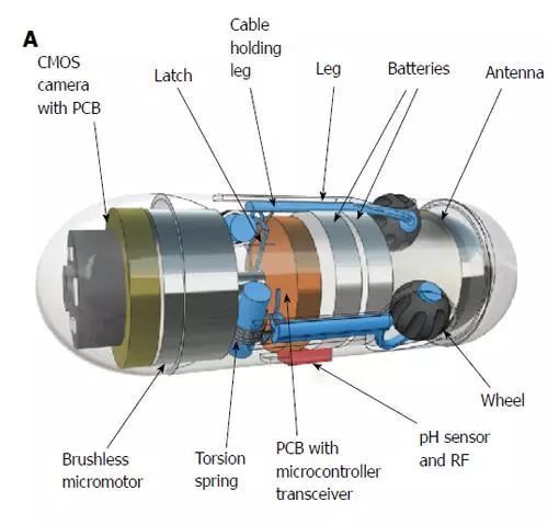它配有3個(gè)微型腿,每個(gè)腿都帶有一個(gè)輪子。這些腿伸出和縮回得益于微電機(jī)和三個(gè)定做扭力彈簧。通過(guò)記錄它們執(zhí)行的每個(gè)旋轉(zhuǎn),車(chē)輪專(zhuān)門(mén)設(shè)計(jì)用作微型里程表。當(dāng)Odocapsule穿過(guò)小腸時(shí),輪子轉(zhuǎn)動(dòng)并且它們的旋轉(zhuǎn)被轉(zhuǎn)換到裝置覆蓋的距離,從十二指腸進(jìn)入點(diǎn)到每個(gè)感興趣的區(qū)域/點(diǎn)。