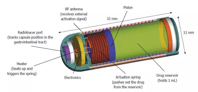 當(dāng)彈簧釋放時(shí),Enterion能夠通過(guò)9毫米開(kāi)口輸送任何類(lèi)型的藥物配方(包括干粉,半固體,懸浮液或溶液配方),迫使活塞沿著膠囊的軸移動(dòng),從而,清空所述容器到胃腸道的特定位置。將放射性標(biāo)記物放置在單獨(dú)的密封示蹤劑端口內(nèi),以允許使用γ閃爍掃描法實(shí)時(shí)觀察膠囊位置?;钊倪\(yùn)動(dòng)還操作開(kāi)關(guān),該開(kāi)關(guān)以精確的頻率傳輸弱無(wú)線電信號(hào)。這個(gè)信號(hào)的檢測(cè)從外部確認(rèn)膠囊已成功?;钊\(yùn)動(dòng)在膠囊末端附近停止,這保持了密封并防止內(nèi)部電子元件與GI流體接觸。