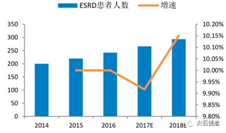 慢性腎病發(fā)展到5期,就進入了終末期腎病階段,隨著腎功能的下降,最終引發(fā)尿毒癥的各種癥狀。據(jù)統(tǒng)計,2014年和2015年我國終末期腎病患者人數(shù)分別達到200萬人和220萬人,預計2018年將達到293萬人,四年復合年增長率達到10.02%。