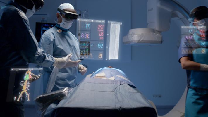 在微創(chuàng)手術(shù)過程中,醫(yī)生不能直接看到和觸摸治療區(qū)域,而是依靠先進的醫(yī)學(xué)成像技術(shù),如超低劑量X射線成像和超聲波,以及其他導(dǎo)航技術(shù),觀察患者身體內(nèi)部并引導(dǎo)專用器械的行動。飛利浦和微軟為HoloLens 2開發(fā)的增強現(xiàn)實概念(augmented reality concept),將目前顯示在大型2D屏幕上的重要數(shù)據(jù)的實時成像和其他來源,轉(zhuǎn)化為一種3D全息增強現(xiàn)實環(huán)境,這種環(huán)境可以被醫(yī)生以人體工程學(xué)的方式輕松直觀地控制。
